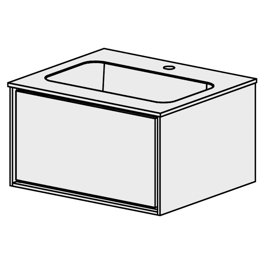 B: 60, H: 34,5 T: 51,5 cm, Abdeckung in Mineralguss weiss, matt mit 1 Becken in der Mitte, ohne Überlauf, 1 Schublade, Schublade mit Blumotion, Dekorrahmen weiss matt, Front gemäss Code, Farbe gemäss Palette, ohne Griff, mit Tip-on, inkl. Raumsparsifon und, Steckdichtung 32 mm