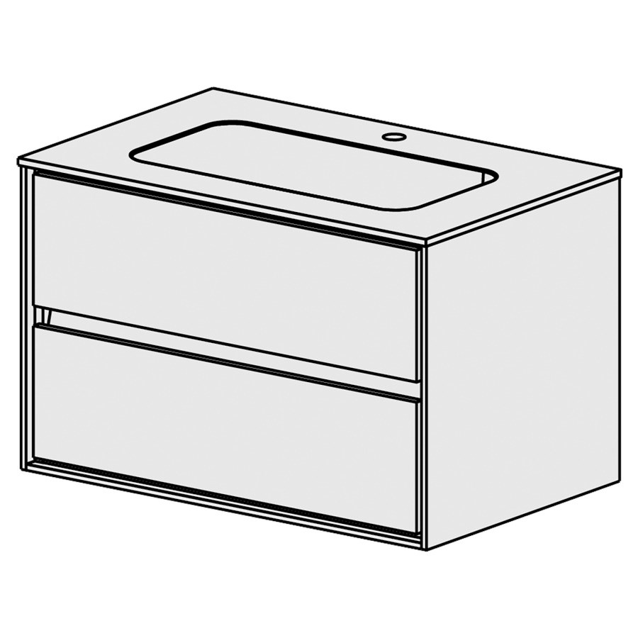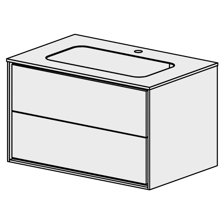 80.5 cm, B: 80.5 H: 48,5 T: 51,5 cm, Abdeckung in Mineralguss weiss, matt mit 1 Becken in der Mitte, ohne Überlauf, 2 Schubladen, Schubladen mit Blumotion, Sichtseiten weiss matt, Fronten gemäss Code, Farbe gemäss Palette, mit Griffleiste in der mitte, inkl. Raumsparsifon und