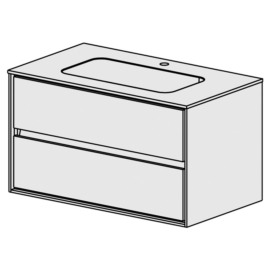 90.5 cm, B: 90.5, H: 48,5 T: 51,5 cm, Abdeckung in Mineralguss weiss, matt mit 1 Becken in der Mitte, ohne Überlauf, 2 Schubladen, Schubladen mit Blumotion, Sichtseiten weiss matt, Fronten gemäss Code, Farbe gemäss Palette, mit Griffleiste in der mitte, inkl. Raumsparsifon und