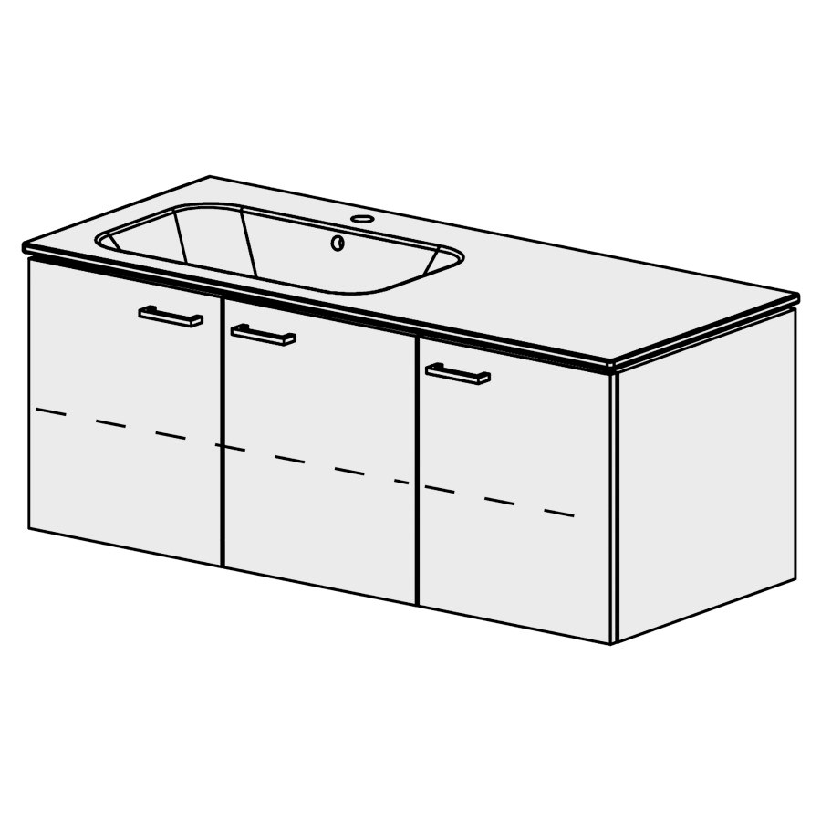 B:121, H:47,5 T:51 cm, Abdeckung in Keramik, weiss,inkl. 1 Becken links, 1 Tablarschrank 2-türig,, 1 Tablarschrank 1-türig,, Türen mit Blumotion, 2 Tablare verstellbar, Griffe gemäss Palette, Fronten/Sichtseiten gem. Code, Farbe gemäss Palette