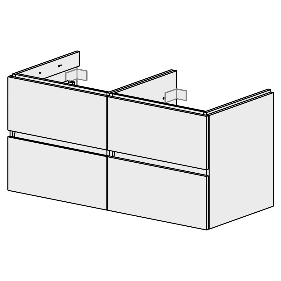 B:119,6, H:55 T:53,8 cm, zu 2 Einbaubecken, 2 x 2 Schubladen,, Schubladen mit Blumotion, mit Dekorleiste, Fronten/Sichtseiten gem. Code, Farbe gemäss Palette, inkl. Raumsparsifon und, Steckdichtung 32 mm