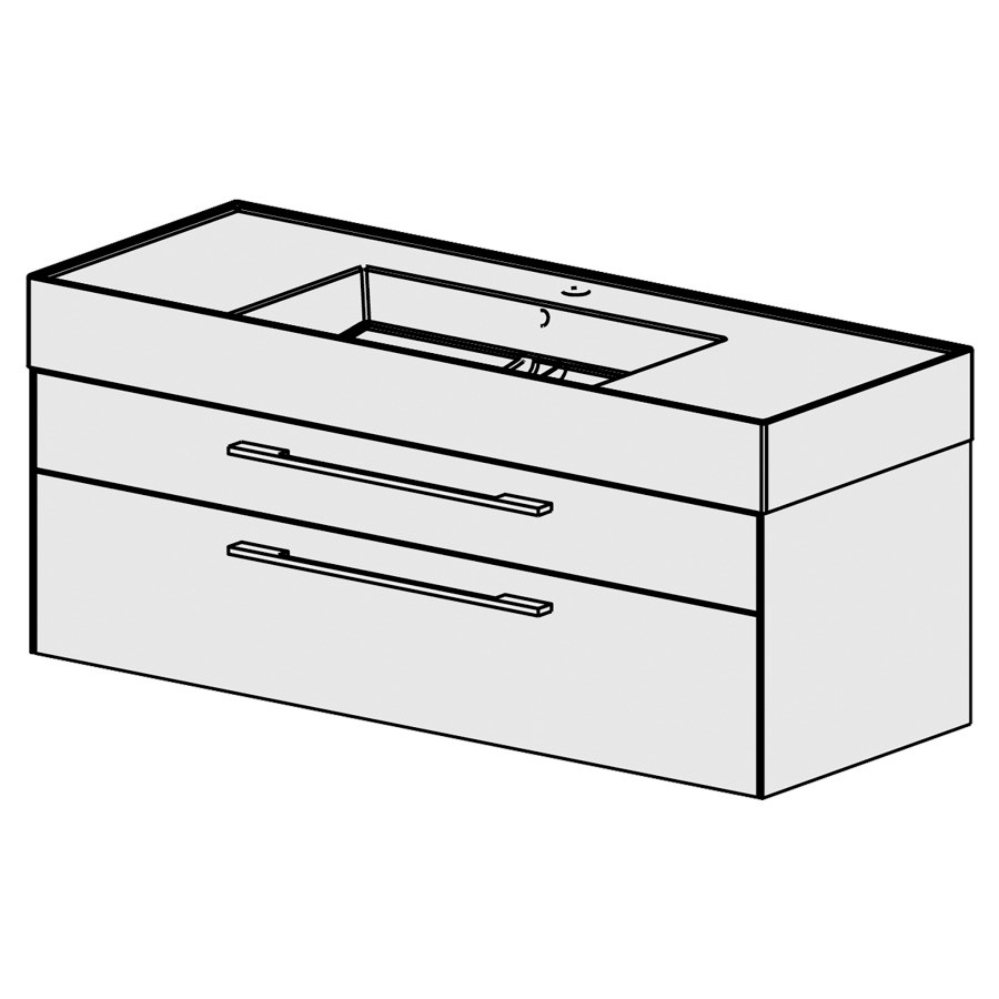 B: 121 H: 51.5, T: 46 cm, mit Waschtisch Keramik, mit 1 Becken in der Mitte, 2 Schubladen, Schubladen mit Blumotion, mit Griffe gemäss Palette, Fronten gemäss Code, Sichtseiten FB, Farbe gemäss Palette, inkl. Raumsparsifon und, Steckdichtung 32 mm