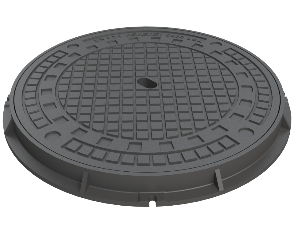 Ausführung/Eigenschaften: Vollgussabdeckung mit Pickelloch und Neopreneinlage, Rahmen aufliegend auf Betonrohr, 250 kN Prüflast, Verwendung: Bereich des Fahrbahnrands und der Bordsteinkante, max. 0,5 m in die Fahrbahn und 0,2 m in den Gehweg hinausreichende Strassenbankette und Parkplätze