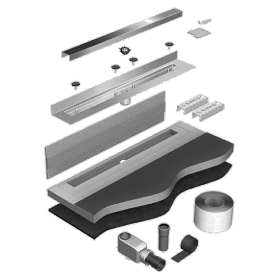 90 x 170 cm, Länge vor Ort anpasbar, wasserdichte Gefälleplatte, Duschenrinne 70 cm, Abdeckung, Standard, Ablauf Primo Plus, Dichtband Permaseal 3133