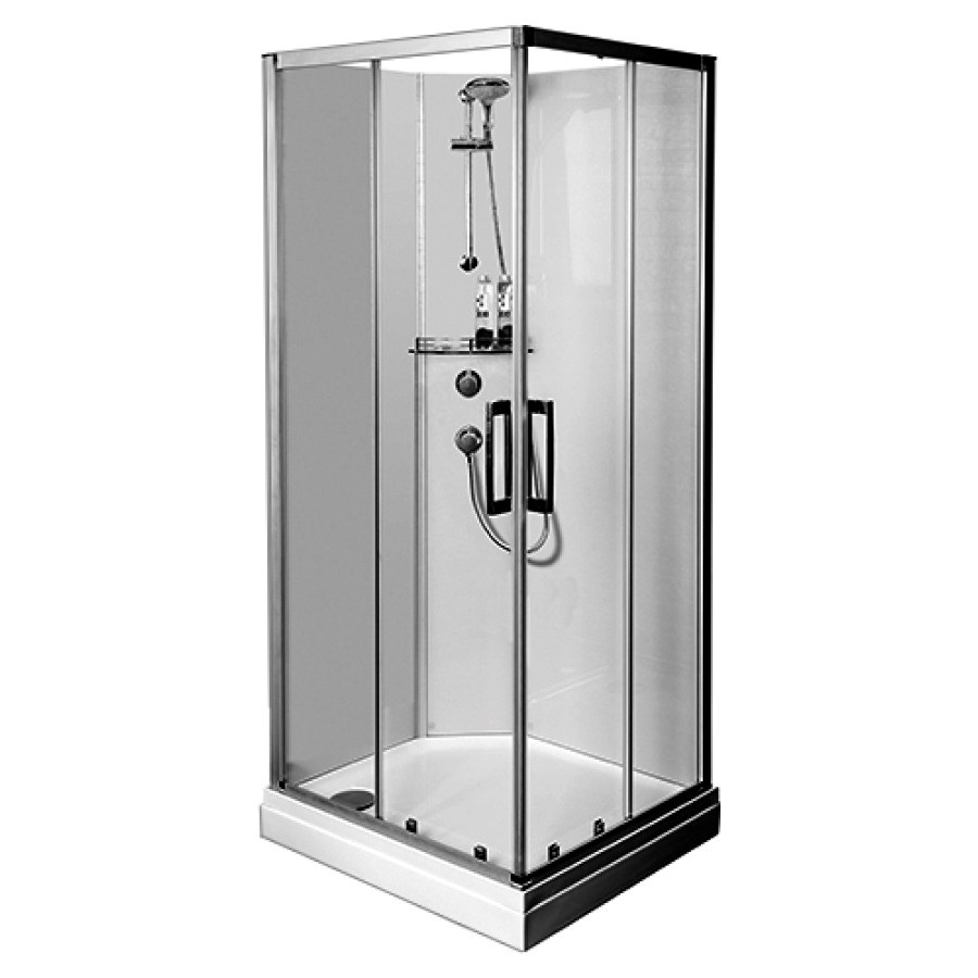 100 x 100 cm, H 208 cm, nicht zusammengebaut, Duschenwanne, Vorderfront, Kunststoff weiss, Rückwände, Siebdruck weiss, Thermostatmischer, Hand-, brause und Schlauch verchromt, Tablar, Ablaufgarnitur D 90 mm, 2 Gleittüren, Echtglas klar