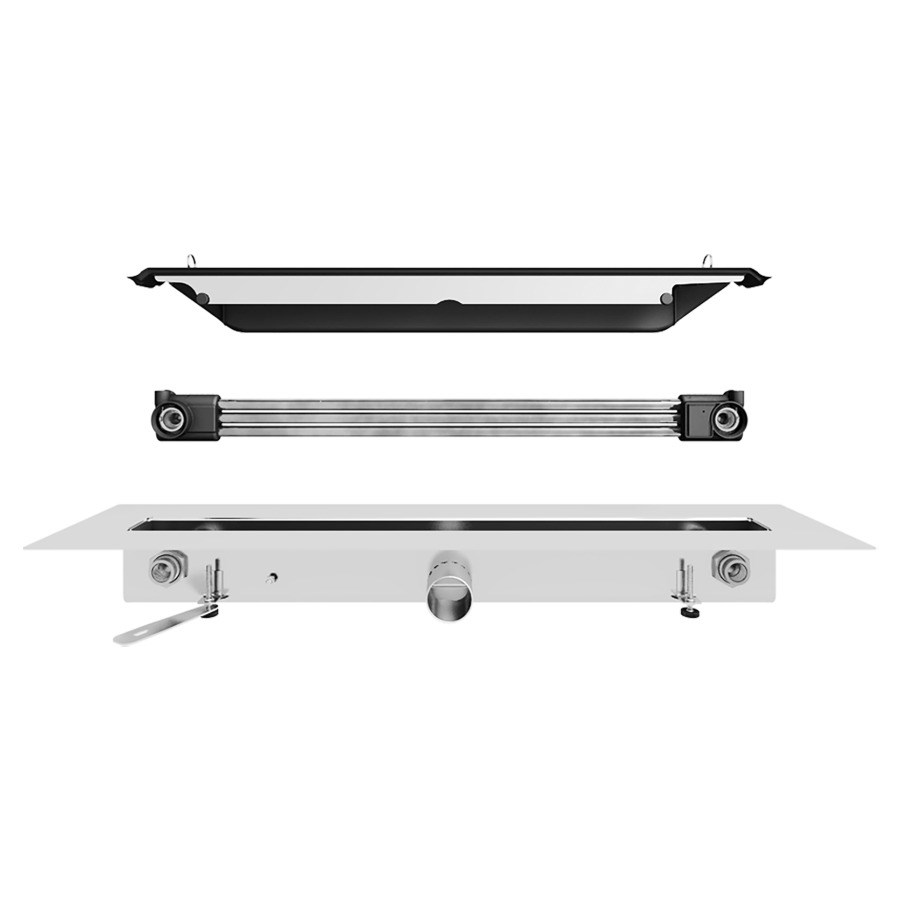 Gesamtlänge 87,3 cm, für exklusive Bodenbeläge, integrierter, 3-Rohr-Wärmetauscher, Ablauf Mitte, horizontaler Abgang, Sperrwasserhöhe , 50 mm, 48 l/min, akustischer, Leckagemelder, mit DT-Siphon, ohne Abdeckung, standard