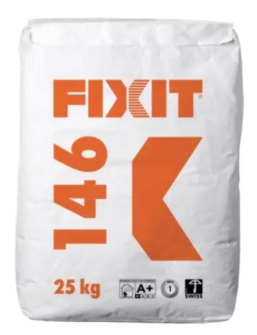 Fixit 146 ist ein einschichtiger Weissputz für den Trockenbereich, als Untergründe sind Backstein, Kalksandstein, Porenbeton, Beton, gipshaltige Bauplatten sowie Grundputze aller Art geeignet, auf Beton und Polystyrolplatten ist vorgängig die Fixit 341 Quarzbrücke R+S aufzutragen, minimale Schichtdicke auf Betondecken 5 mm, auf Grundputze und gipshaltige Bauplatten 2 mm, Verarbeitungszeit ca. 45 min, Verbrauch ca. 1 kg/m²/mm