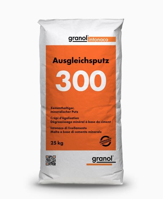 Granol Ausgleichsputz 300 ist ein zementhaltiger mineralischer Putz mit einer maximalen Korngrösse von 1 mm für den Innen- und Aussenbereich, geeignet zum Egalisieren grober, mineralischer Oberflächen und zum Ausbessern von mineralischen Grundputzpartien, gipshaltige Untergründe sind nicht geeignet, auf Beton ist dem Ausgleichsputz 300 pro Sack 1-2 kg Granolin Haftzusatz beizumischen, Schichtstärke 2-5 mm, Verarbeitungszeit ca. 2 Stunden, Verbrauch ca. 1,6 kg/m²/mm