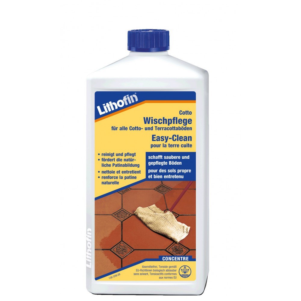Konzentriertes Reinigungs- und Pflegeprodukt auf Basis natürlicher Seifen mit hochwertigen Pflegekomponenten, speziell für Cotto- und Terracottabeläge, es löst durch seine oberflächenaktiven Inhaltsstoffe Verschmutzungen aller Art, so dass diese mit dem Wischwasser aufgenommen werden, an der Oberfläche bleiben (ohne Schichten zu bilden) spezielle Pflegekomponenten zurück, dadurch wird der nächste Wischvorgang erleichtert und die Patinabildung begünstigt, bei laufender Verwendung wird der Belag von Mal zu Mal schöner in Farbe und Struktur sowie unempfindlicher, Lithofin Cotto Wischpflege hinterlässt einen angenehm frischen Geruch, ca. 20-30 ml (ein Schuss) pro Eimer (10 Liter) in möglichst handwarmem Wasser genügt