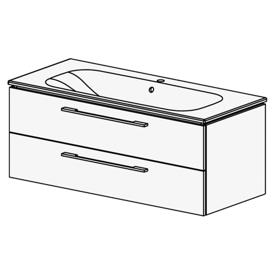 121 CM, B: 121 / H: 49 / T: 51 cm, Keramikwaschtisch weiss, mit Überlauf, mit 1 Becken in der Mitte, 2 Schublade, Griff gemäss Palette, Fronten/Sichtseiten Modern,
