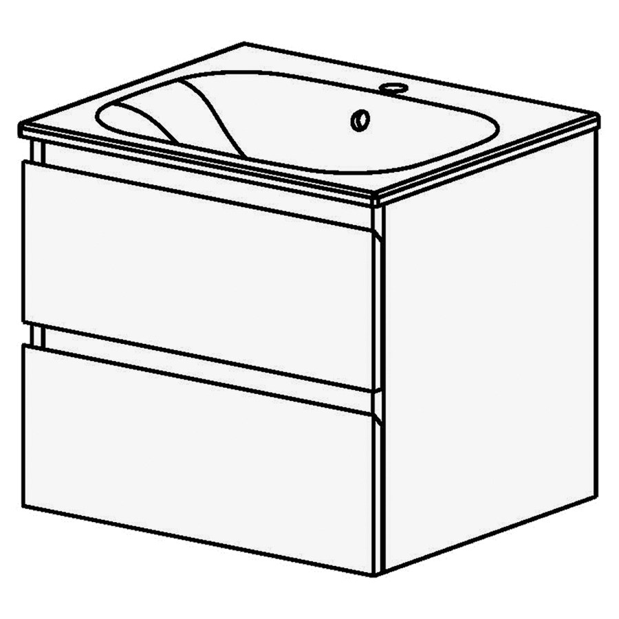 B: 61 / H: 54 / T: 51 cm, Keramikwaschtisch weiss, mit Überlauf, mit 1 Becken in der Mitte, 2 Schubladen, mit Griffleiste (oben + mitte), Fronten und Sichtseiten gemäss, Code