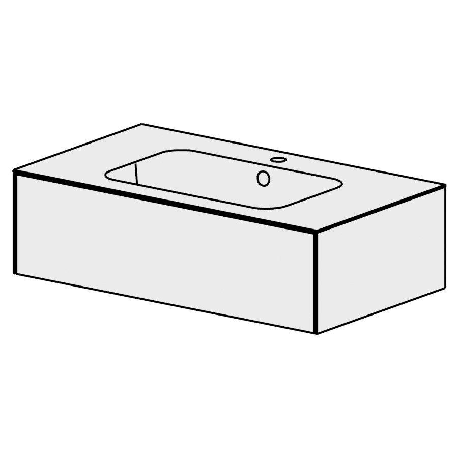 B: 89,6 H: 27,1, T: 51,5 cm, mit Waschtisch in Mineral-art, mit 1 Becken in der Mitte, 1 Schublade, Schublade mit Blumotion, mit Tip-on, Front gemäss Code, Sichtseiten FB, Farbe gemäss Palette, inkl. Raumsparsifon und, Steckdichtung 32 mm