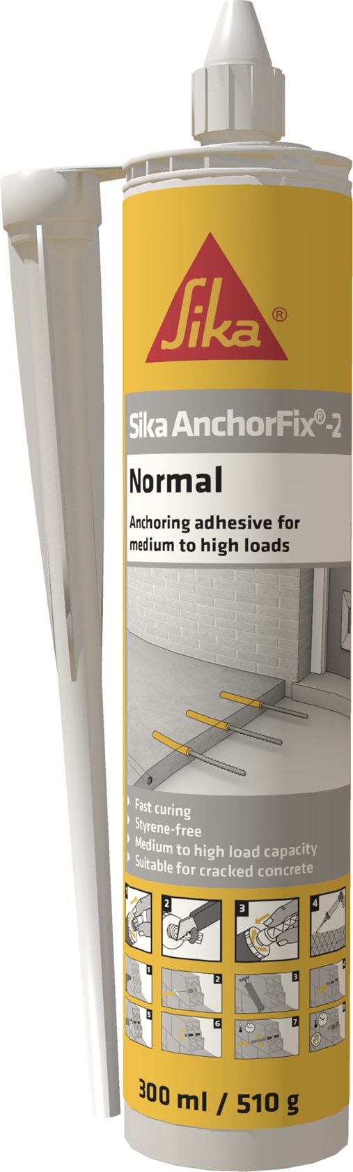 Sika AnchorFix-2 Normal ist ein styrol- und lösemittelfreier, 2-komponentiger Ankerklebstoff (für mittlere bis hohe Lasten) auf Epoxid-Acrylat-Basis für normale gemässigte Klimabedingungen, für Befestigungen für allen Arten von Armierungseisen, Gewindestähle, Bolzen und diverse andere Ankersysteme in Beton, massivem Mauerwerk, Stahl, Bohrlochtiefe und Durchmesser beachten, Bohrlöcher staubfrei ausbürsten und mit einer Ausblaspumpe oder Druckluft ausblasen (Wichtig: Ölfreie Druckluftgeräte verwenden), Druckfestigkeit ca. 70 N/mm² (7 Tage, +20°C), Biegezugfestigkeit ca. 29 N/mm² (7 Tage, +20°C), Zugfestigkeit ca. 15 N/mm² (7 Tage, +20°C), Verabreitungstemperatur Luft & Untergrund +5°C bis +35°C, Aushärtezeiten: Bei +5°C bis +10°C Offenzeit ca. 18 Minuten - Aushärtung ca. 145 Minuten, Aushärtezeiten: Bei +30°C Offenzeit ca. 4 Minuten - Aushärtung ca. 35 Minuten