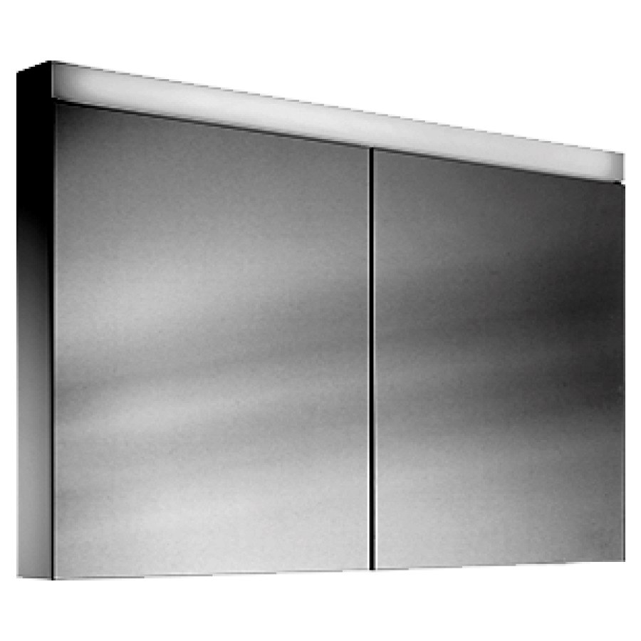 Aluminiumprofil, 100 x 70/76 x 12 cm, 2 Doppelsteckdosen oben rechts, wechselbar nach links, und unten an Zwischenwand, rechts, 2 Doppelspiegeltüren, direkte LED-Beleuchtung oben, 17 W, IP24, Lichtfarbe warmweiss 3000K