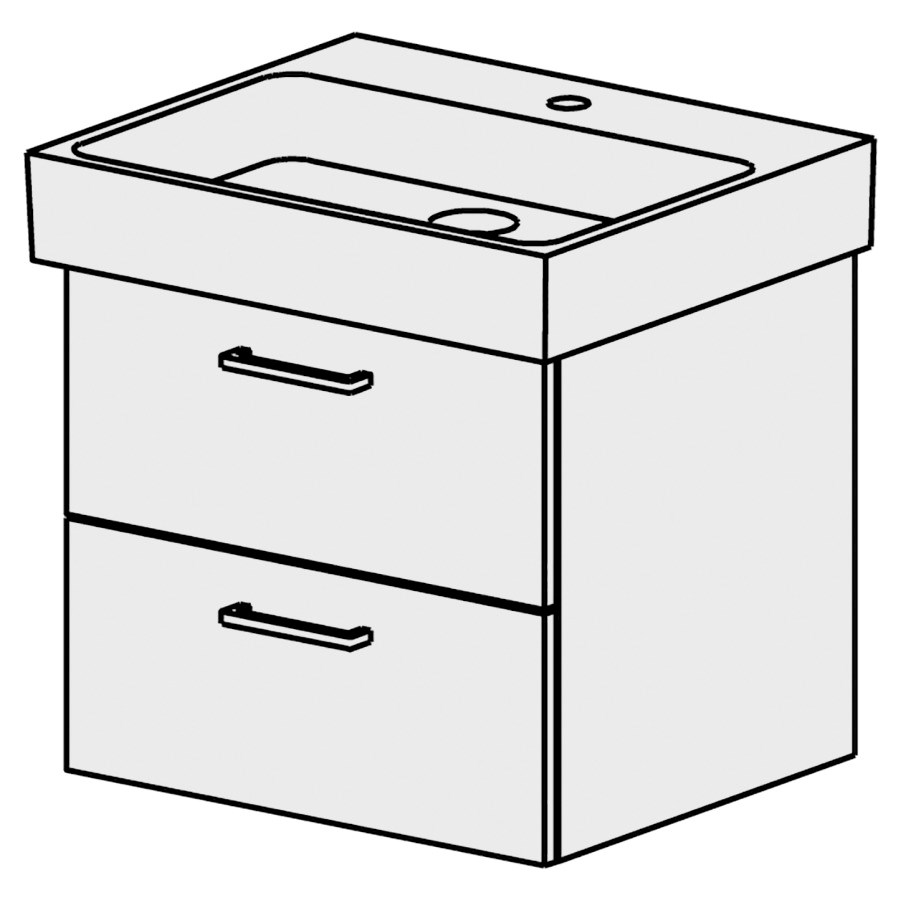 B: 51 H: 46, T: 43,8 cm, 2 Schubladen, Schubladen, mit Blumotion, Griffe gemäss Palette, Fronten/Sichtseiten gem. Code, Farbe gemäss Palette, für Raumsparsifon und, Steckdichtung 32 mm