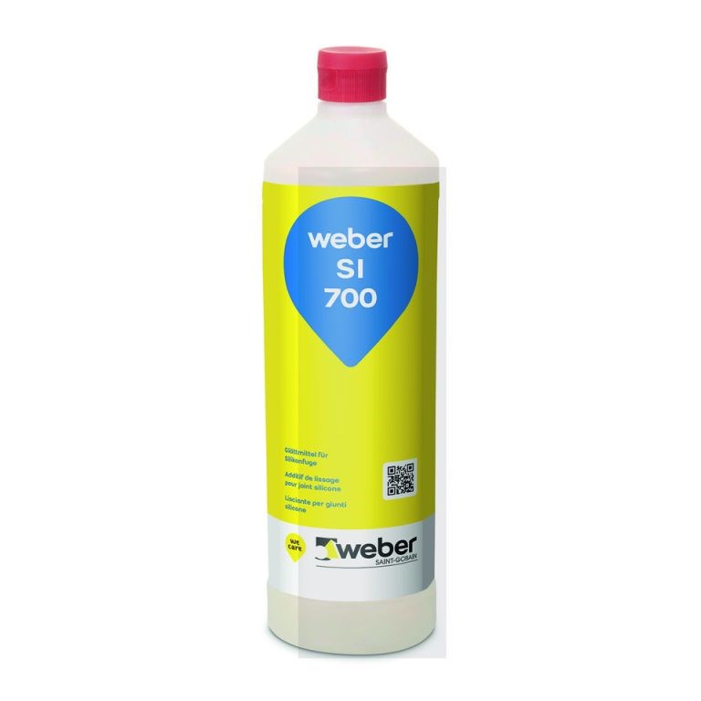 Abgestimmtes, gebrauchsfertiges Glättmittel für Weber Silikon K+N Plus, vor der Hautbildung des Silikons mit dem Glättmittel weber SI 700 anfeuchten und mit geeignetem Werkzeug, z.B. FugenProfi, glätten, Rückstände des Glättmittels vom Belag (Keramik, Naturstein, etc.) sofort entfernen, um eventuelle Fleckenbildung zu verhindern